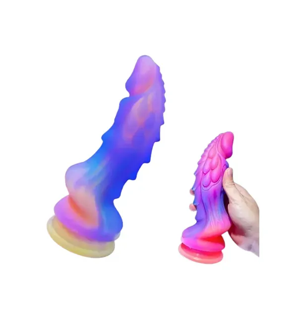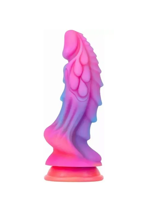 Consolador con diseño de dragón, su acabado es muy compacto y tiene varias pliegues con protuberancias para una mayor estimulación, su grosor es considerable e indicado para un nivel avanzado, brillar en la oscuridad por su efecto neo, cuenta con base ventosa para pegarse en la pared o piso.
