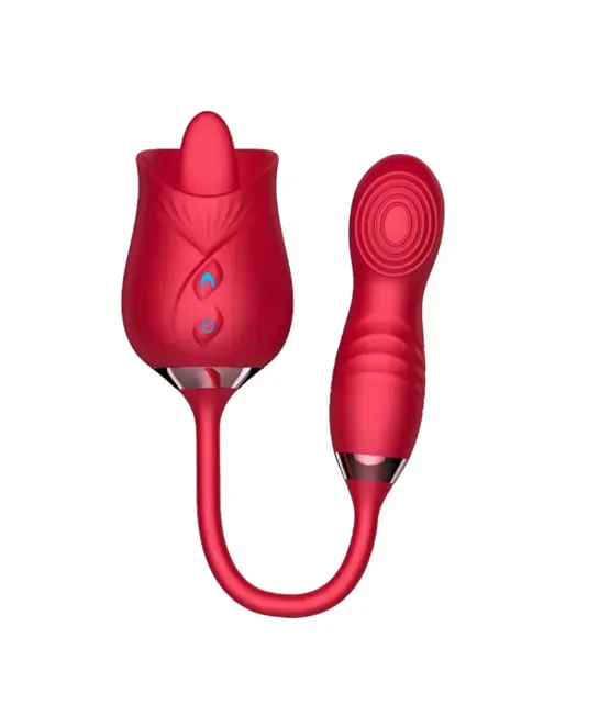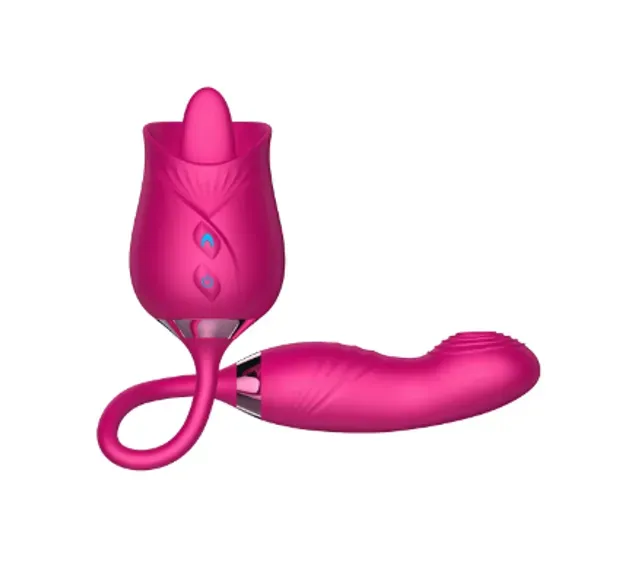 Vibrador con forma de rosa para uso discreto, su lengüeta estimula el clítoris y su cola inferior masajea el punto G con sus movimientos laterales, tiene resistencia al agua.